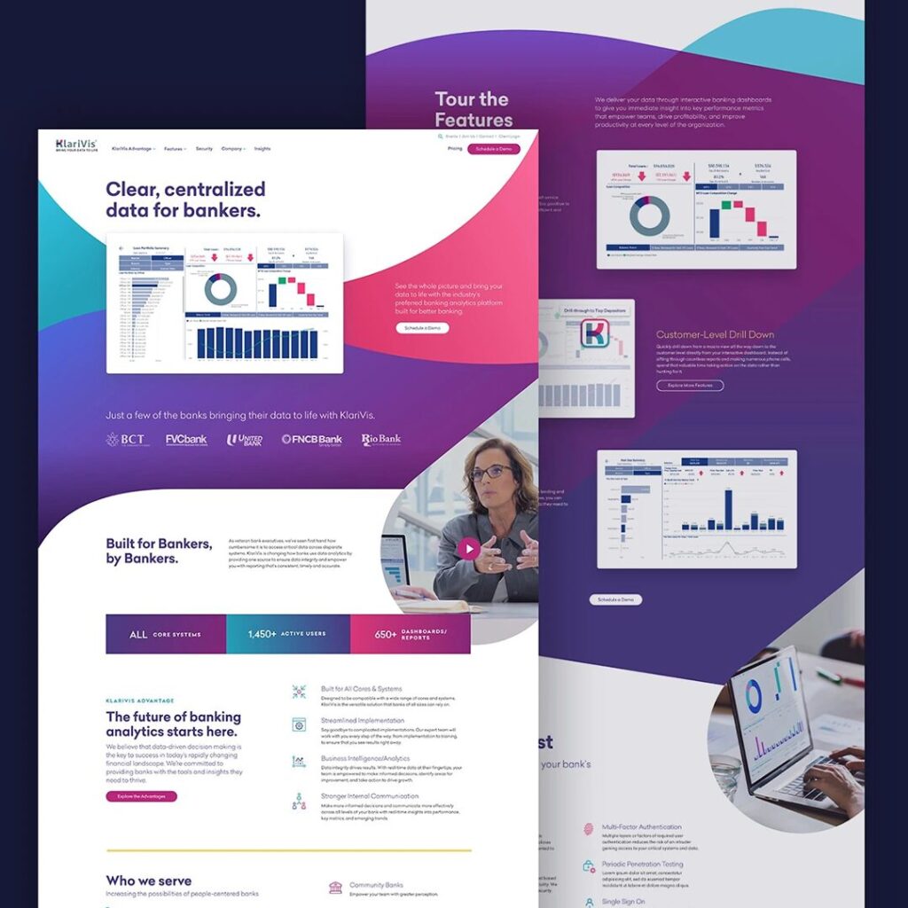 The architecture had to accommodate different entry points and mindsets, from early adopters to cost-conscious skeptics. Vitamin worked with KlariVis to organize content around functional roles within a bank (executives, sales, credit, finance) and universal problem sets (decision-making, customer insights, efficiency, risk management).
