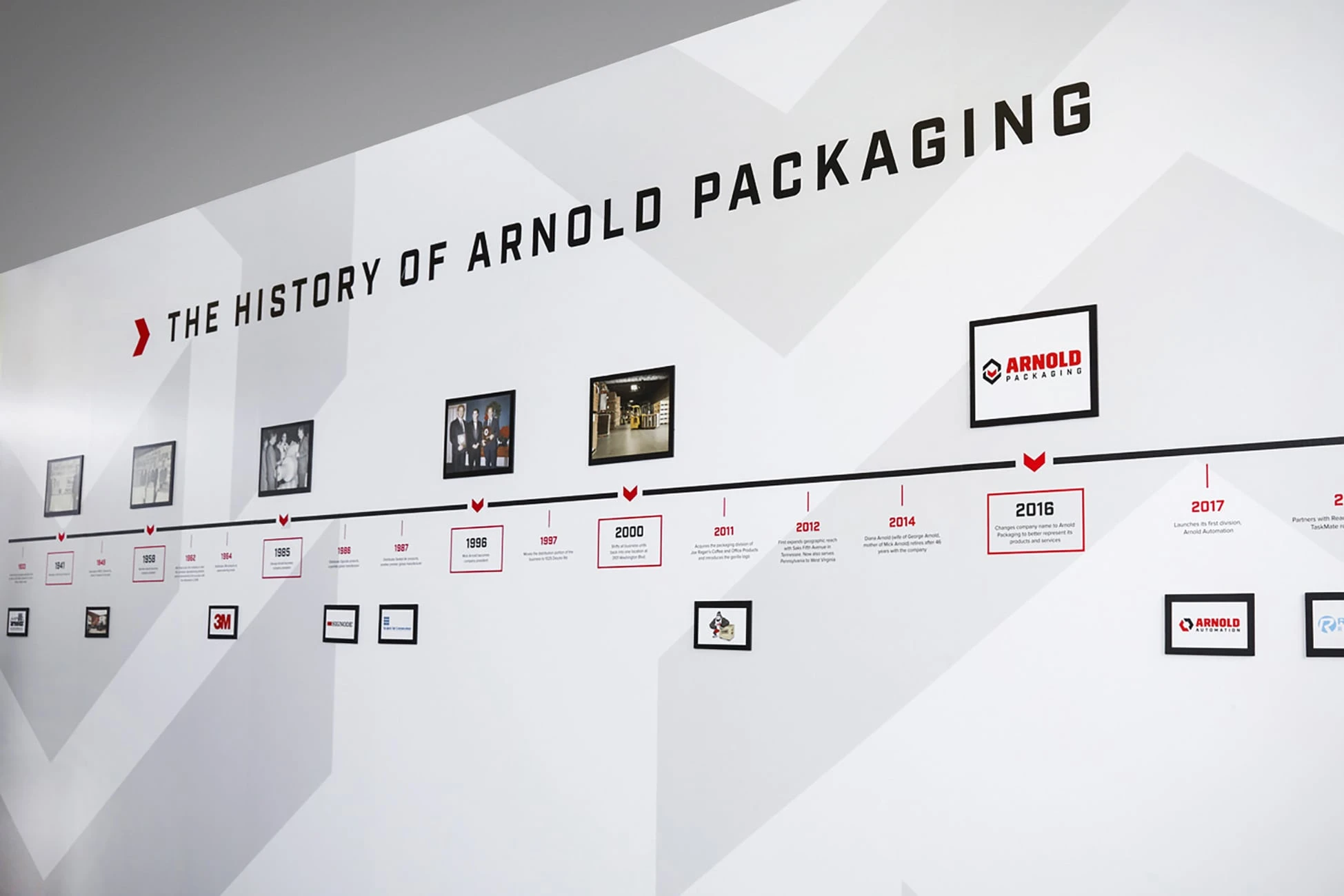 Vitamin partnered with Arnold Packaging to bring the new brand to life throughout their corporate office, including lobby, interior walls surrounding the workspaces, and their conference room. Highlights of the project include an 85th year anniversary timeline and an employee wall featuring tenured employees.