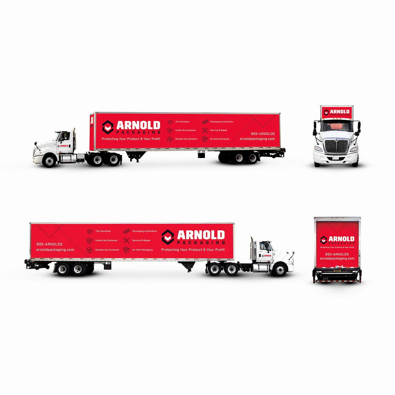 Vitamin redesigned Arnold’s delivery fleet from the ground up. We designed branded, applied graphic wraps to convey the updated identity and product/service offering. Ten vehicles in total were wrapped: two 18-wheelers and eight 27-foot box trucks. The result is a unified fleet that is messaging Arnold Packaging’s difference up and down the highway every day.