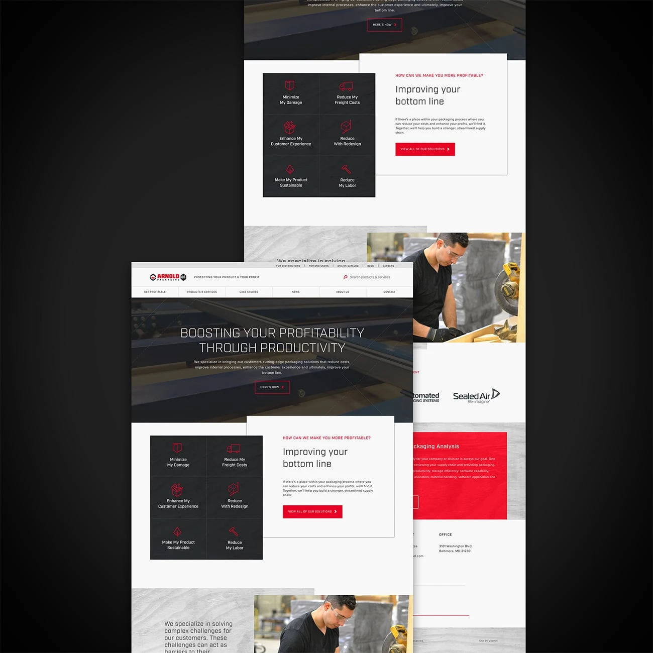 The Arnold Packaging website leverages video along with custom photography of the team and manufacturing plant to tell a compelling story of how Arnold Packaging increases productivity and profitability. Landing pages, navigation and content strategy quickly funnel visitors to specific solutions for complex challenges, where the conversion from visitor to prospect is made easy through the presence of sales team contact information and lead generation forms designed to dynamically segment leads.