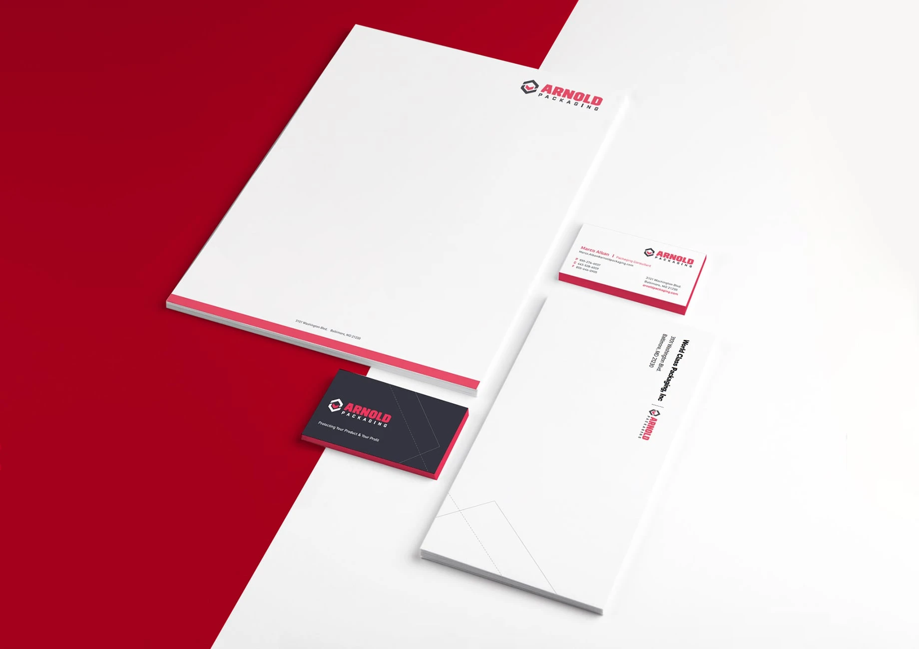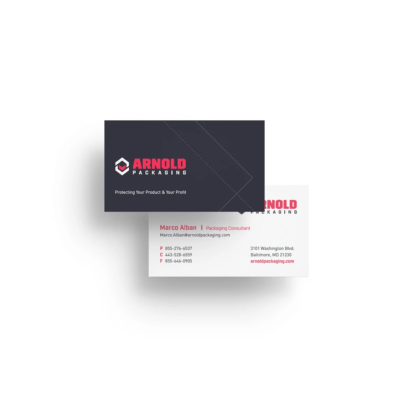 Arnold Packaging’s business cards were designed to reflect the rigid, tactile nature of their product line. Vitamin used two sheets of 120# double-thick cover, glued them together and painted the edges in the bright, bold red selected as the primary brand color. The result is a card with presence and tooth. The print collateral uniquely incorporates all new brand elements, including thin lines and dashes that are reminiscent of the cut and fold lines in packaging.