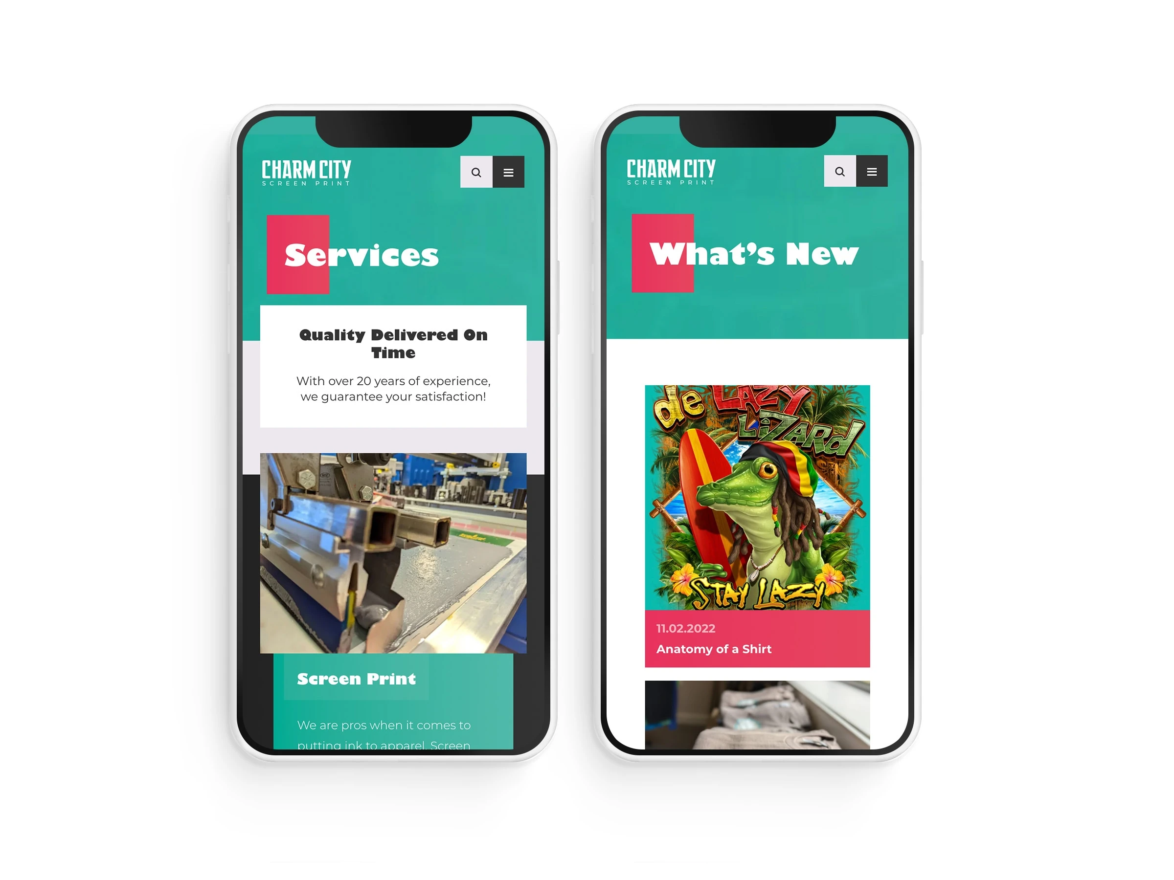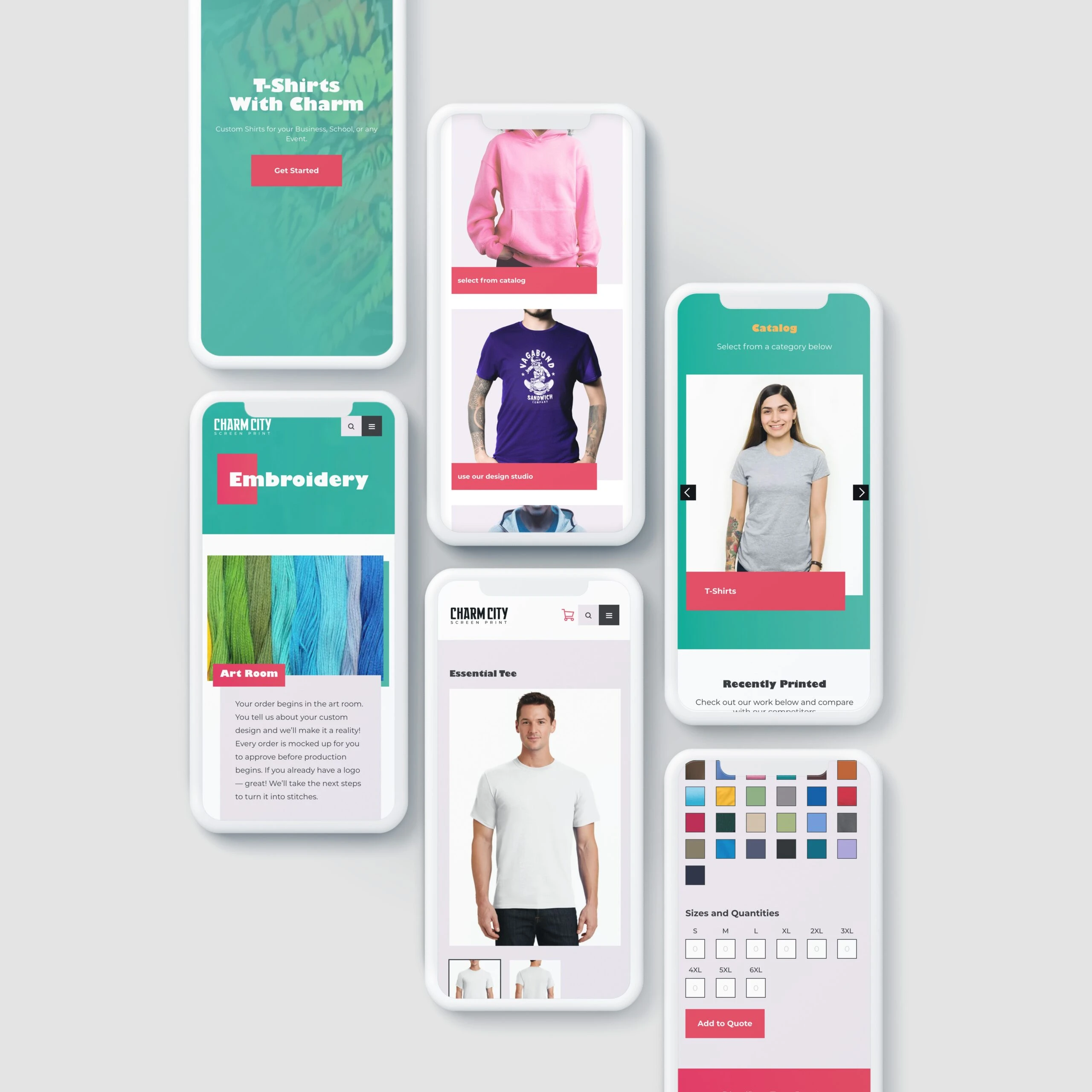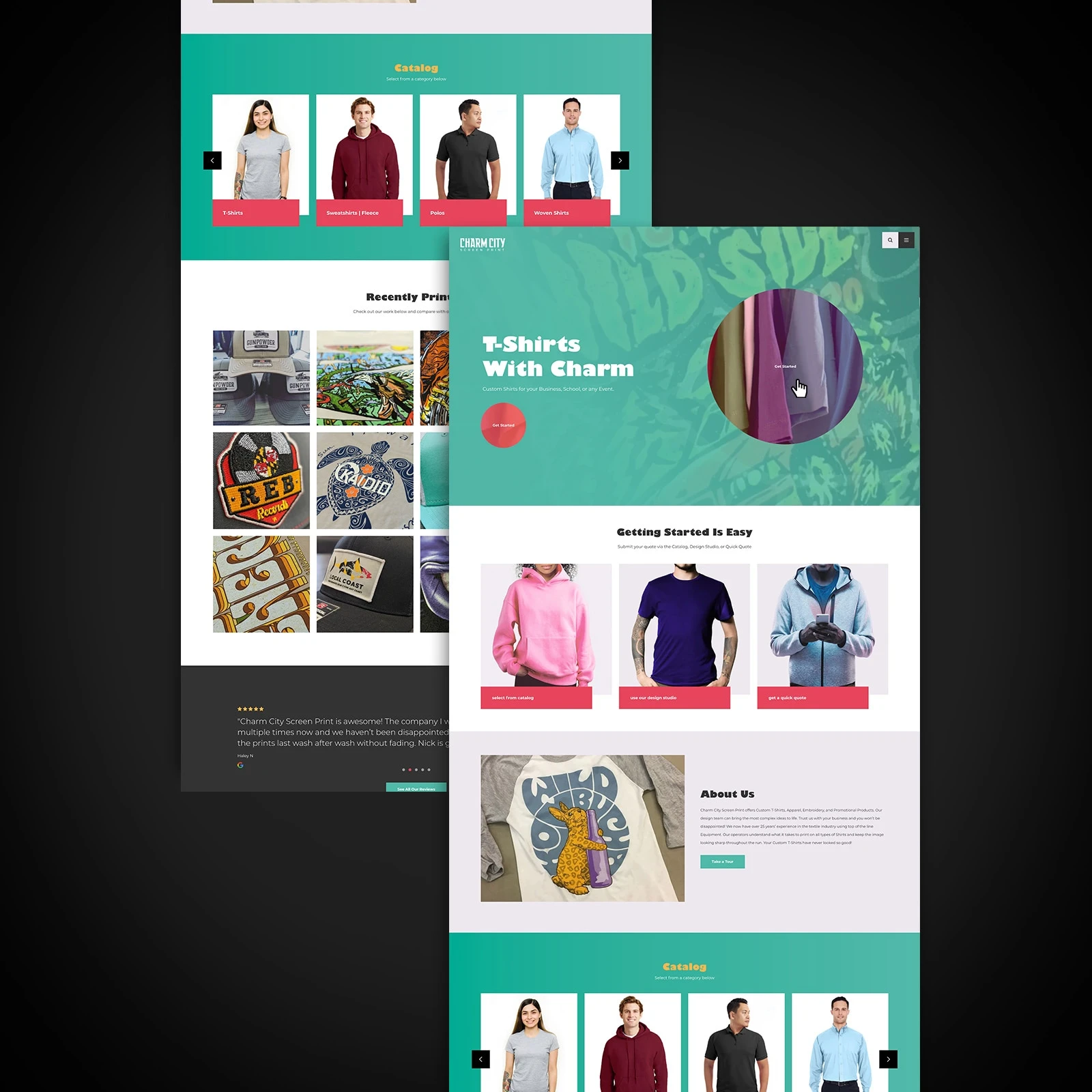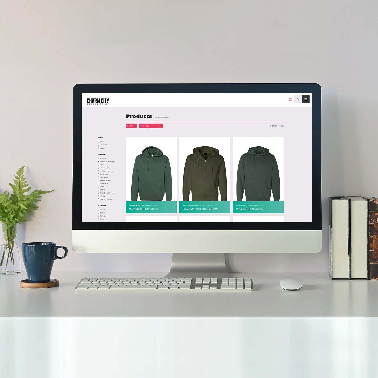 The new Charm City Screen Print website solves three issues simultaneously. It provides a platform for consistent branding and marketing, simplifies how customers receive a quote, and uses best practices to enhance functionality and scalability for product import and ecommerce. Hours of research and testing also resulted in a long-term solution for importing indexing and displaying the countless options for apparel stock.