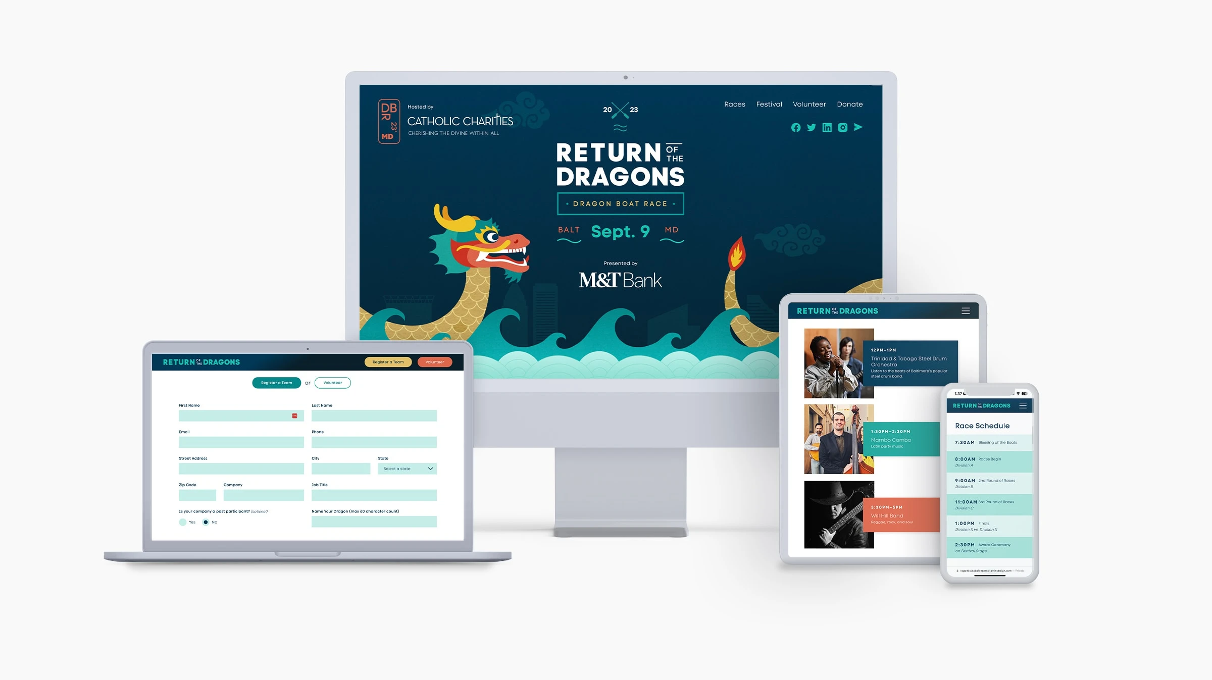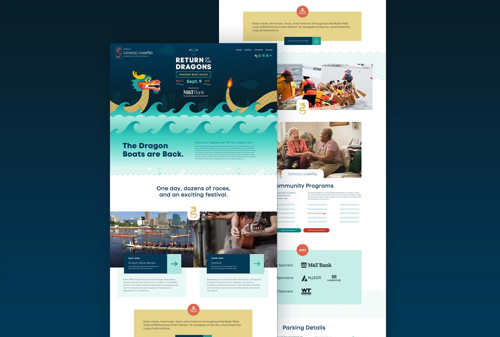 Two phases, first to drive team participation, and second for the public to attend. Focused on family fun. A unique UX challenge was that the race and festival had two different times. it became two events in one. We needed to create two paths so the user wouldn’t get the timing details of the race mixed up with the festival and music. This allowed us to go into further detail on both the race timeline and festival attractions.
