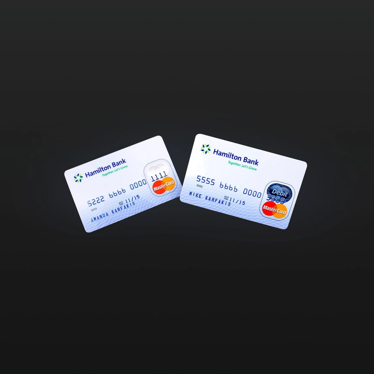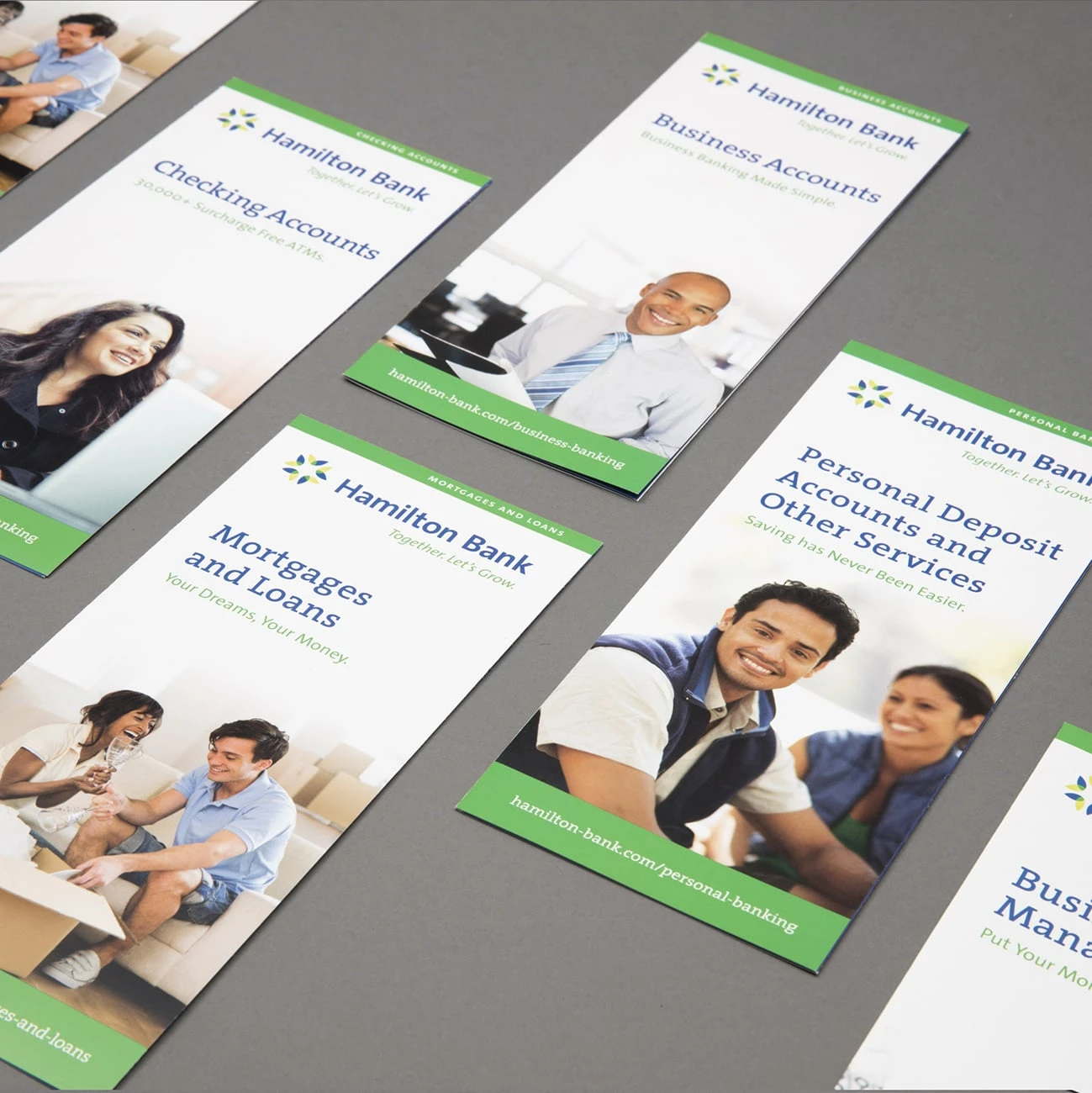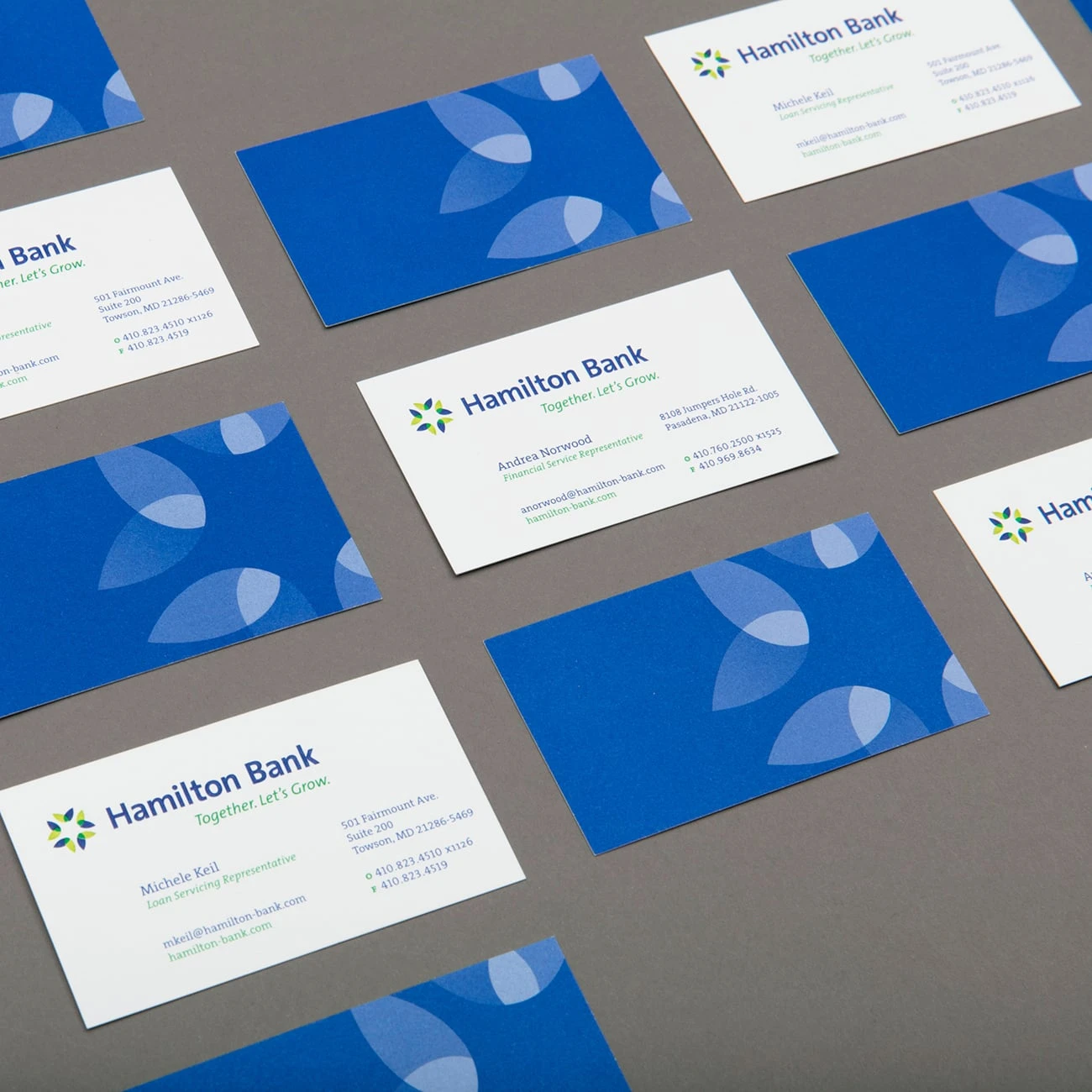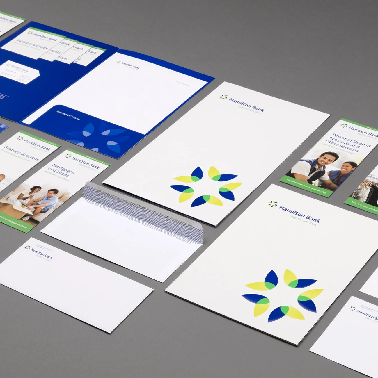 The stationery collateral and business cards fully reflect the fresh look of the new brand. The logo and tagline are presented on all printed materials in bright, highly saturated greens and blues that pop, showcasing Hamilton Bank as a contemporary brand with years of stability and hard work under its belt.