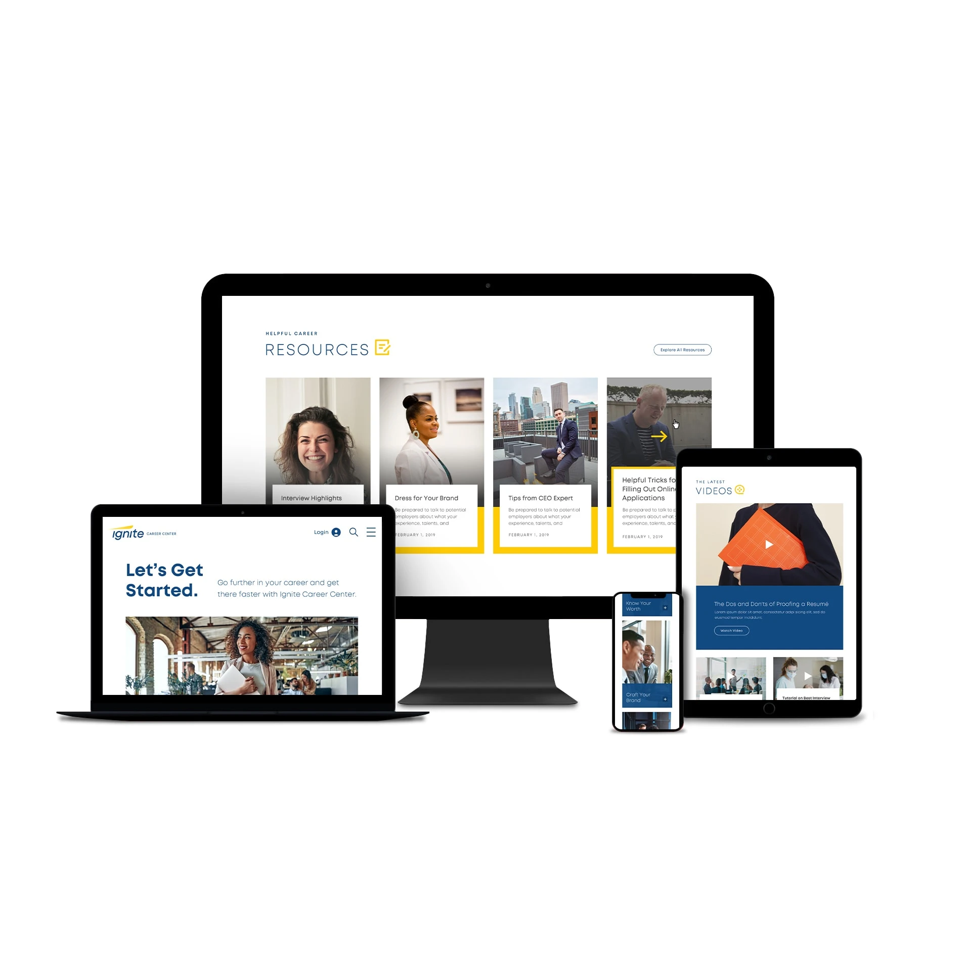 The new brand evokes initiative, action, and momentum, and positions the Ignite Career Center as a jumping off point toward success. Our visual identity exemplifies the flow, form and direction of the written content creating a powerfully knit brand that exudes confidence, hope, light and energy.